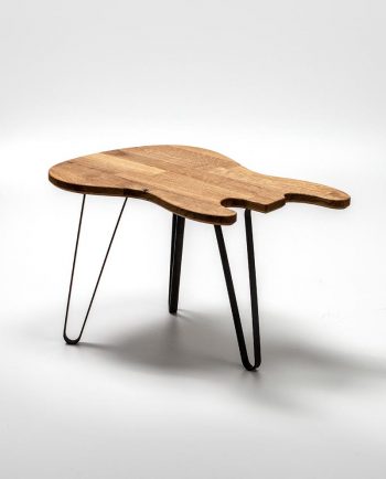 Het tafelblad is een geschaalde versie van de oorspronkelijke gitaarvorm. We hebben het hout behandeld met natuurlijke houtolie (zonder oplosmiddelen), zodat de rijke kleur, structuur en houtnerf van het hout optimaal naar voren komt. Door de combinatie van de gitaarvorm en de rechte metalen poten past deze tafel in nagenoeg ieder interieur en elke muziekstudio. De tafel is een unieke blikvanger!